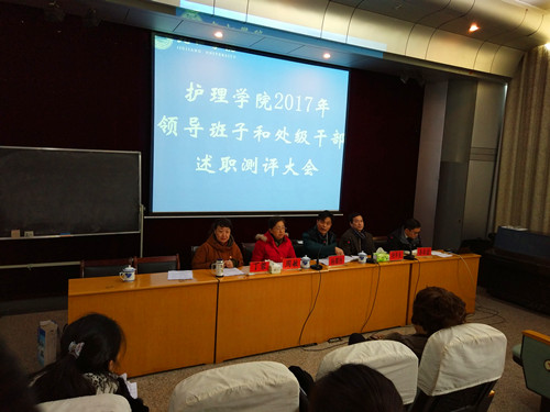 述职测评大会由周敏副部长主持。党委书记丁蓉同志首先代表学院党委班子从思想政治建设、廉政建设、作风建设、及内涵建设等方面进行了全面汇报。特别就党建方面、全员育人、内涵建设等工作进行了重点汇报,并就自己一年的工作进行了述责、述廉。随后,胡华良院长就2017年度行政工作及其个人履职进行了述责、述廉,易本谊副院长就个人履职方面进行述德、述廉、述责、述法。全体教职工对学院领导班子及处级干部个人年度工作客观认真地进行了测评。