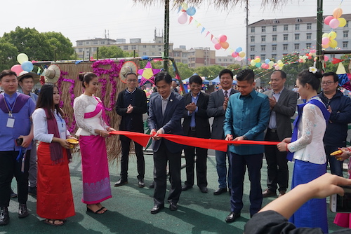 4月15日早晨,一座稻草和竹子巧妙搭建的迷你版吴哥寺轮廓的大门出现在九江学院主校区北区田径场,这是九江学院柬埔寨留学生花费一周时间提前制作完成的。从“吴哥寺”大门进入,两排整齐的帐篷构成一座极具柬埔寨民族风情的“村落”,呈现在观众眼前。上午10:00,开幕式正式开始,九江学院副校长陈春生先生致开幕词,他首先向从全国各地来浔参加本次文化节的柬埔寨同学致以新年的问候,并表示“希望以这次文化节为新的起点,将来的每届柬埔寨文化节都能成为中柬两国文化交流和青年对话的平台,也期待九江学院柬埔寨文化节能够走向社会,辐射更广,对中柬友谊的持续发挥更深远的影响。”九江学院副校长杨耀防与柬埔寨驻中国学生会主席Um Vnty共同为开幕式剪彩。开幕式后,柬埔寨留学生们在摆满鲜花和谷物的祈福台前,进行传统祈福仪式。随后,柬埔寨留学生们伴着优雅而欢快的音乐声载歌载舞,在旁观看的中国青年学生也被庆祝新年的欢快气氛感染,不断有同学加入到舞蹈的队列当中。“村落”两旁的帐篷里有的挂满了柬埔寨民族衣饰,有的铺开几张小桌,上面摆满了各式各样的柬埔寨小吃,精致的外表和鲜艳的颜色吸引着周围的人群不断上前来品尝。在“村落”的最前端,一座帐篷别具一格,内外贴满了表现中柬友好交流史话的文字和图片,一些同学驻足于此,认真地浏览着这些柬埔寨同学们精心准备的图文。
