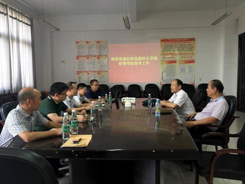 9月2日下午,纪岗昌副校长在科研处王侃民处长的陪同下,来到经管学院看望慰问了获得2018年国家基金项目的高阔、张应华博士并指导工作,经管学院院长项益才、党委书记花金龙、副院长高阔、吴登丰陪同并参加了座谈。