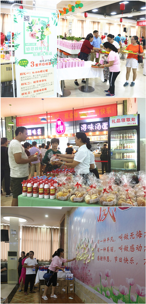 中午11点半,教工食堂人头攒动,电子屏幕上“热烈庆祝第34个教师节,祝全体教师节日快乐”的祝福映入眼帘。浓郁的节日气氛感染了每一位前来的教职工,食堂一楼琳琅满目的商品引来很多的老师驻足、询问。上楼的扶梯布满了彩带,餐桌上带着各种祝福语的心形气球流光溢彩。餐厅正前方“向辛勤的园丁致敬!向人类灵魂的工程师致敬!”的标语异常醒目。饮食服务中心精心安排的节日套餐,营养而丰富,6.66元的寓意套餐,祝福老师们事事顺心。老师们喜笑颜开,纷纷觉得后勤人想得周到。外语学院张老师开心的说到,“这么实惠而又营养的午餐吃在嘴里,暖在心里,不仅美味,更加有爱”。前来就餐的所有教职员工还幸运的得到了一份饮食服务中心精心准备的伴手礼,精致的包装盒,“桃李满天下,春晖遍四方”,九院饮食服务中心祝全体教师节日快乐的祝福让每位就餐的老师嘴角挂满了微笑。来自机材学院的退休教师王老师赞叹说,“后勤的饮食服务一直做得很好,也考虑到了我们退休职工,这次送的教师节礼物,有新鲜的桃子和李子,寓意桃李芬芳,这样的活动让我们退休教师很感动,后勤是真正地把教师们放在了心里,我很高兴。”节日的舞台上,饮食服务人还准备了一面祝福墙,到场的教师纷纷提笔祝福,写下了一段段感人的文字,有祝学院前程锦绣,有祝教师节日快乐,也有祝后勤百尺竿头更进一步的良好祝愿。上墙的所有教师均得到了后勤管理处精心准备的爱心定制礼罐。校领导中午也光临了教工食堂,并充分肯定了饮食服务中心心系教师,服务学校的一贯努力,希望饮食服务中心再接再厉,真正做到让全校教职员工满意、放心。