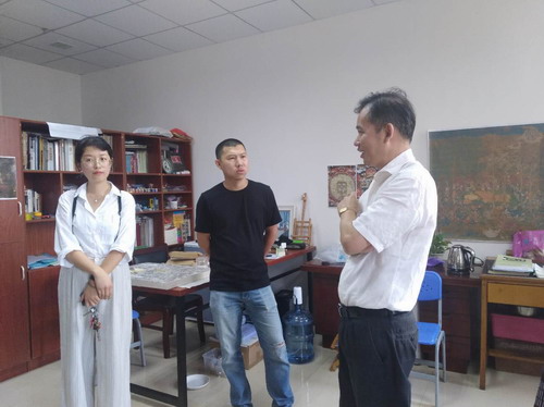 在学校去年引进的高层次人才王静漪老师的工作室,赵伟书记认真欣赏了王静漪老师所作的岩彩壁画作品,并与王静漪、刘结锋等青年老师进行了亲切交流,肯定了他们在工作上所作出的努力,并希望近两年来引进的高层次人才尽早成长为艺术学院发展过程中的黄金一代。
