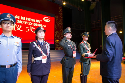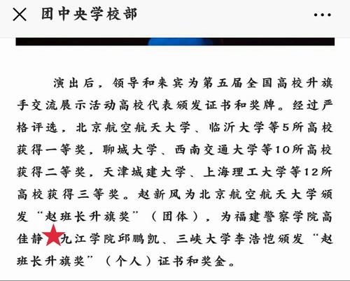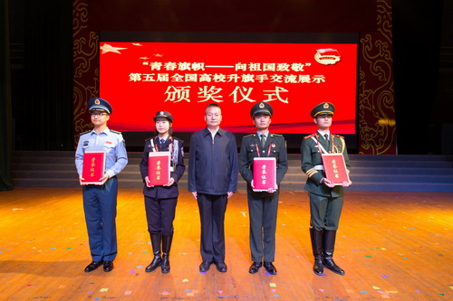9月29日,由团中央学校部、全国学联秘书处主办,中国国旗网、北京新风旗帜文化传播中心承办,中国人民解放军陆军防化学院支持的第五届全国高校升旗手交流展示活动在9.3阅兵训练场成功举办。经网络投票、国旗下演讲、队列技术动作、国旗知识、国旗论文等多环节评比,我校国旗班班长邱鹏凯荣获“全国高校十佳标兵升旗手”和“赵班长升旗奖”,同时九江学院获优秀组织奖荣誉。朱德外孙刘建将军,原天安门国旗班第八任班长、全国高校升旗手总教官赵新风等嘉宾出席颁奖。