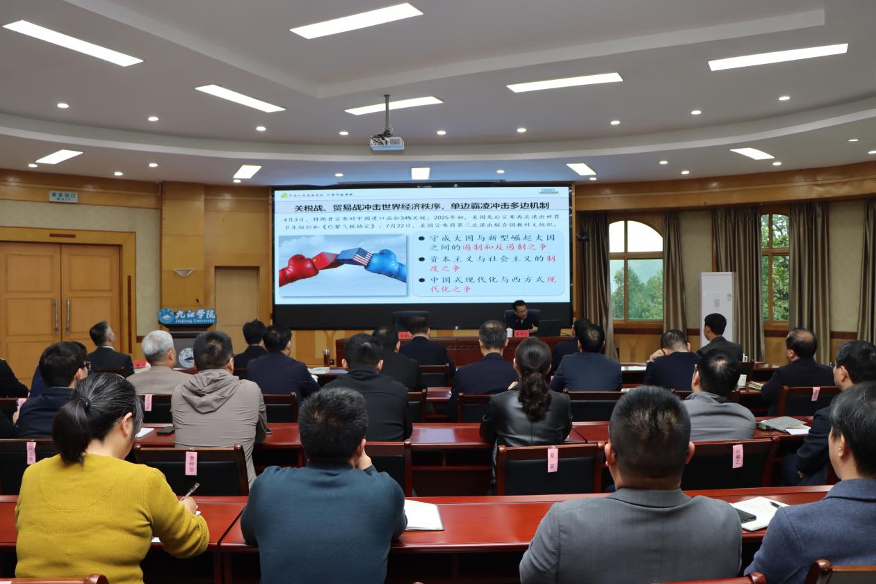 会议邀请省委党校(江西行政学院)党史党建教研部张师平博士作《习近平谈治国理政》第五卷专题辅导讲座。讲座视野开阔、内涵丰富、剖析透彻,从《习近平谈治国理政》第五卷出版的时代背景与重大意义、总体框架与鲜明特色、核心要义与实践要求三个维度展开深入解读,系统梳理了著作中贯穿的马克思主义立场观点方法。