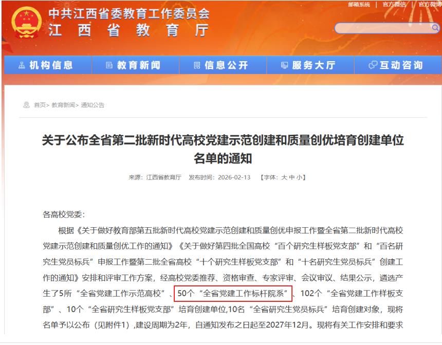 日前,中共江西省委教育工委正式印发《关于公布全省第二批新时代高校党建示范创建和质量创优培育创建单位名单的通知》,我校马克思主义学院入选“全省党建工作标杆院系”培育创建单位。