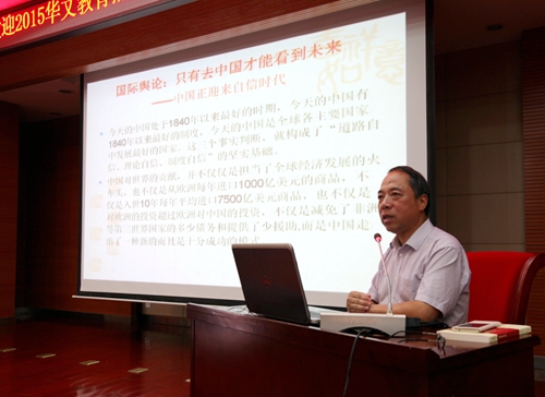 9月15日上午,九江学院校长甘筱青在逸夫楼——图书馆学术报告厅会见了“华文教育·杰出人士/华校校董华夏行——江西之旅”代表团成员,并举行了专题讲座以及座谈活动。副校长杨耀防参加了会见并致欢迎辞。甘筱青作了题为“中国特色社会主义文化发展道路”专题讲座。从中华历史中分析中华文化发展道路,横向纵向的对比中华文化发展的利弊,最后肯定社会主义核心价值观的现实意义,总结如今的文化发展的三大战略任务:一、“以理服人”,提升国际话语力;二、坚持中西交融,开展文明对话;三、创新传播体系,重建社会信仰。