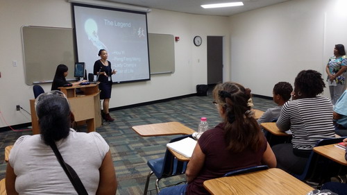 在孔子学院张春子老师的安排和帮助下孔子学院学员Grace、Sanya和Latasha给大家带来了中秋节文化介绍,她们用精心制作的幻灯片向到场人员展示了中国中秋节的起源来历以及各种传说。学员Latasha 用标准的汉语朗诵了中国诗歌《静夜思》让在座学员惊叹不已。孔院老师还现场教观众说:中秋节快乐!月亮、月饼等词。