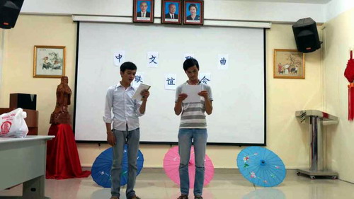 “明月几时有,把酒问青天。不知天上宫阙,今夕是何年……”3A班集体合唱,用一曲《水调歌头》优美的词句、舒缓的曲调拉开中文歌曲联谊的序幕;“还没好好的感受,雪花绽放的气候,我们一起颤抖,会更明白什么是温柔……”4A班不甘示弱,一首《红豆》娓娓道来相思的哀愁。合唱结束后两个班级用“剪刀、石头、布”、拉歌的小游戏,各派代表交替上台演唱,《时间都去哪儿啦》、《童话》、《天黑黑》、《隐形的翅膀》、《他不爱我》、《星月神话》、《你怎么说》、《彩虹》、《从此心里有个你》、《醉相思》……