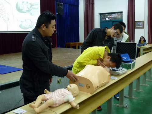 当天晚上,九江市红十字会钱逢鑫、黄哲平老师分别在文理报告厅、文友楼317室介绍了院前急救的最新知识,强调了大学生在生活中掌握急救方法的重要性,还就创伤出血、中暑、溺水、电击、意外伤害等常见急症的急救措施和要领做了详细讲解。并在现场演示了如何判断患者意识、心跳骤停需要掌握的方法及徒手心肺复苏的示范动作,并就国内外心肺复苏的一些新观点和新知识做了简明扼要介绍,他们深入浅出、诙谐幽默的讲述让同学们听得十分投入。