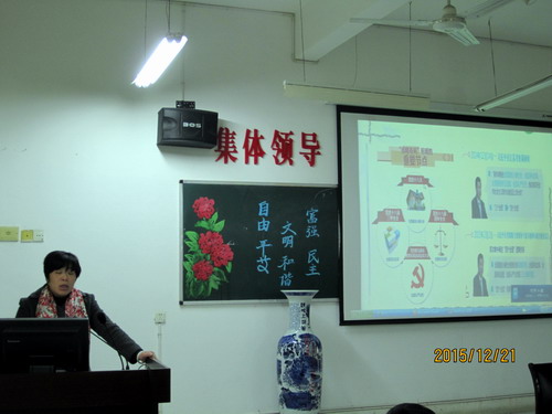 为进一步提升党员干部的理论素质,扎实开好党委班子“三严三实”专题民主生活会,12月21日下午,外国语学院特邀请市委党校周慧兰教授到外国语学院315党员活动室作了一场践行“三严三实”专题党课讲座,外语学院党委班子与教工党员参加,杨杰书记主持党课讲座。