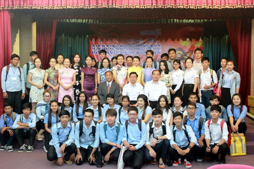 谢莫尼勒阁下向在座的大学生介绍了柬埔寨王家研究孔子学院的工作性质,这是一所传播中国语言和文化的教学机构,也是一所科研机构,更是搭建中柬友谊之桥梁。他还给同学们推荐了几本由孔子学院编著的,介绍中国民俗、在柬华人中华民俗活动的书籍,如《中国灯笼》、《千年友好—中柬交流史话》、《孔子—无冕之王》、《扶南时期的高棉哲学》。最后,勒院长提出了两点希望:一是王家文化与艺术大学派专家来孔院讲授柬埔寨文化;二是在王家文化与艺术大学开设中国文化课程。