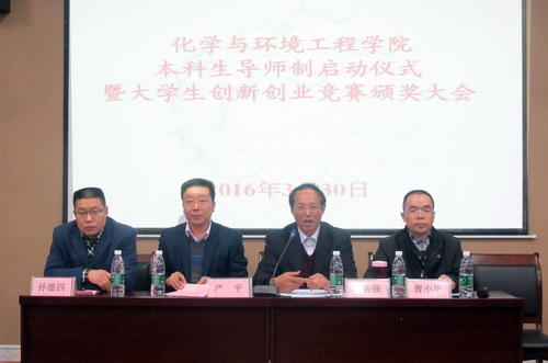 3月30日下午,化环学院在向学楼201隆重召开化环学院本科生导师制启动仪式暨大学生创新创业技能竞赛颁奖大会。学院党委书记刘新强、院长严平、副院长孙德四、曹小华、学院全体教师及2015级本科班全体同学和大学生创新创业技能竞赛的获奖者参加本次会议,会议由严平院长主持。