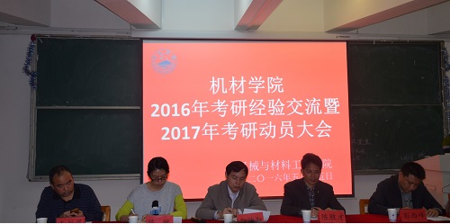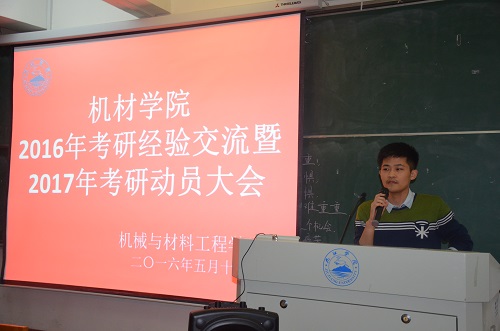 寒窗书剑十年苦,指望蟾宫折桂枝。5月15日晚,机材学院于竞知楼阶梯教室五举行2016年考研经验交流暨2017年考研动员大会。机材学院院长张德勤,党委副书记陈胜才、陈娜,团委书记彭西峰,学生科副科长李新萍,学生科部分老师及大二大三有意向考研的同学参加了本次大会。大会由机材学院团委书记彭西峰主持。