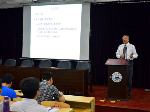 关伟教授从六个方面向同学们讲解了美国大学教育体系。第一,大学类型的选择,他强调在选择的过程中要理性分析,综合考量,谨慎选择自己的理想大学;第二,如何鉴别大学的质量,他从五个方面向同学们介绍了快速鉴别大学质量的技巧;第三,值不值得到美国留学,在这个问题上,学生自身目的、职业设想、求学费用等因素对抉择的影响;第四,如何申请美国大学。他结合自身经历,详细介绍了有关申请日期、材料的完整性、大学间的校际交流等各方面细节要求;第五,修课问题,他结合中西方教学的差异,向同学们讲解了在美国修课所要注意的学分、专业构成、辅导员作用、教学大纲等方面的问题;第六,在美国学习的注意事项,他着重强调了个人在美国社会中的独立性及保持自信的重要性。然后,关教授结合会计专业的特点,着重介绍了美国的金融体系,他采用视频播放的方式向大家直观展现了美国金融的发展,并从资金的转移等方面向大家介绍了美国短期市场及长期市场的发展状况。讲座尾声,关教授和同学们分享了自己的人生体会,并以“自尊,自爱,自信,自立,自强”与同学们共勉。最后,罗书记作了简要的总结,讲座在一片热烈的掌声中结束。