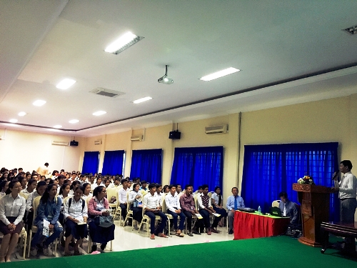 5月27日,柬埔寨王家研究院孔子学院马德望国际大学汉语中心本周再次迎来新的汉语班级,并成功举办开班典礼。马德望国际大学校长李来(LY Lay)、赛萨恩(SEN Saing)、办公室主任严贝(YAN Pich),汉语教师蔡钦,汉语教师志愿者胡阔锋以及百余名新生参加了此次开班典礼。