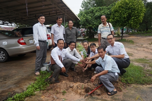 7月11日,西港高中校长高吴提(KHOV Vuthy)、副校长张多德(CHAN tradeth)、柬埔寨王家研究院孔子学院西哈努克省高级中学汉语中心柬方负责人王浩(Nivoth),西港高中教师代表及孔子学院汉语教师志愿者共同种下了代表孔子学院和西港高中深厚友谊之树。