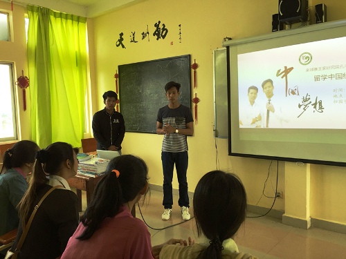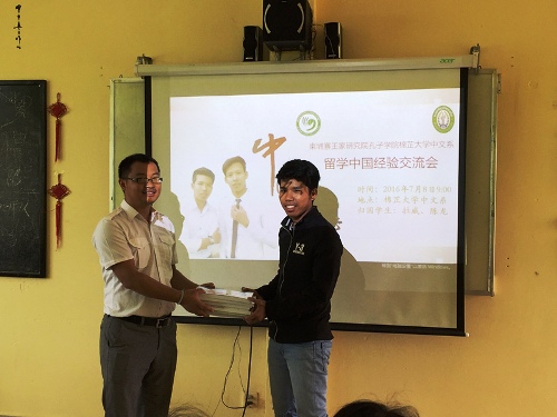7月8日,柬埔寨王家研究院孔子学院棉芷大学中文系举行了留学中国经验交流会,由留华归国学生陈龙(CHAN CHHENG LONG)、拉威(LOVN RAVY)两名同学向棉芷大学中文系学生介绍了他们在中国留学期间的生活和学习经历。