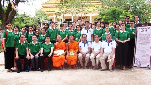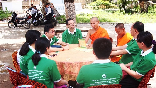 孔院教师的到来受到佛寺副住持索昆提(Venerable SOK KUNTHEA, Vice Master of the Pagoda)的欢迎,夏院长代表全体教师表达了谢意和祝福。他说,孔子学院的建立是应世界各国汉语学习者的需求而搭建的汉语学习平台,目的在于为汉语学习者提供汉语教学服务,同时加强中外文化交流。他表示,柬埔寨王家研究院孔子学院成立以来得到了柬埔寨政府和社会各界的大力支持,在柬工作的汉语教师一定继续努力,以报答柬埔寨人民的厚爱,为汉语教学和中柬友好做出贡献。寺庙住持诵经祈福,为教师们洒圣水,抛洒茉莉花,寓意平安健康、和乐美满,并为中柬人民祈福。