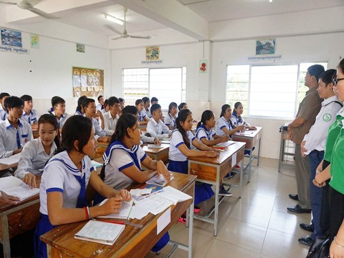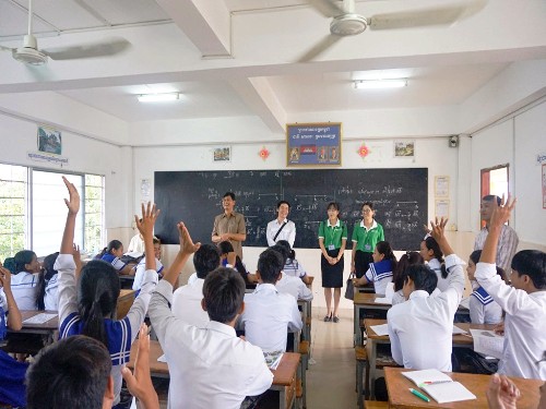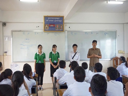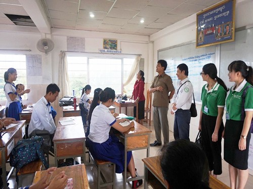 10月12日,柬埔寨王家研究院孔子学院马德望国际大学汉语中心负责人九江学院选派孙海瑞老师与马德望国际大学副校长赛森(Saing Sen)一行赴博那学校(Bora)做招生宣传。此次招生宣传主要面向该校即将升入大学的高中生,接受招生宣传班级达20个,学生约520多人,招生宣传活动持续近3个小时。