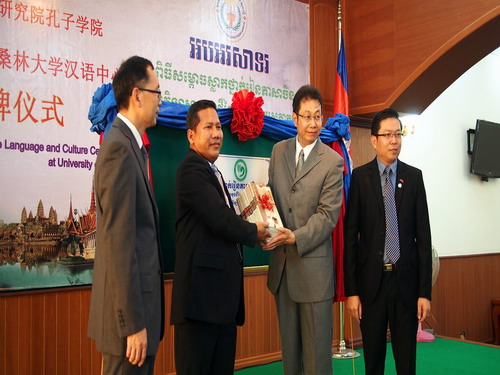 克洛媞达院士和张德意社长为特本克蒙省韩桑林大学汉语中心揭牌,该中心是柬埔寨孔子学院在柬埔寨的第9个省开办的第30个汉语教学点,韩桑林大学是由中国政府援建的新开办的公立大学,位于柬埔寨的特本克蒙省。 随着孔子学院在柬埔寨各界的影响越来越大,越来越广,孔子学院将逐步在柬埔寨各省设立汉语教学中心,以满足柬埔寨民众学习汉语的需要。