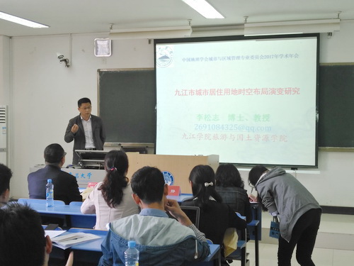 李松志教授在会上做了题为“九江市城市居住用地时空布局演变研究”的交流发言,他从九江城区居住用地空间布局演变过程、特征、成因、趋势等方面阐述了过去30年间九江城区居住用地的发展变迁,并就国内二、三线城市的空间结构变化和居住用地空间结构演变问题与参会代表进行了深入讨论。