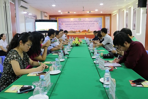7月10日上午,中国高等职业教育代表团访问柬埔寨王家研究院孔子学院,孔子学院院长谢莫尼勒(HE Chea Munyrith)、中方院长夏修龙、院长助理陈晶雯热情接待了代表团一行。