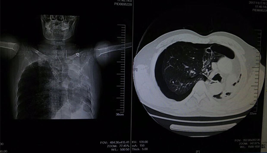 该患者为中年男性,胸闷,气促,休息后症状无缓解,来院就诊时全身大汗淋漓,口唇发紫,呼吸困难。临床医学院/附属医院医生询问病史后,发现该患者病情较复杂,且患者及家属对既往病史情况不太了解。考虑情况危急,当班医师立即组织抢救,给予吸氧、建立静脉通路及行胸部CT,同时请胸外科医师急会诊。经详细检查后,发现患者右肺自发性气胸,如不及时救治将危及生命。医务人员立即为患者做了右胸腔穿刺排气抢救,后给予胸腔闭式引流。在全体医护人员一个多小时的努力下,患者病情得到缓解,患者及家属对临床医学院/附属医院医务人员的精湛医术表示感谢。