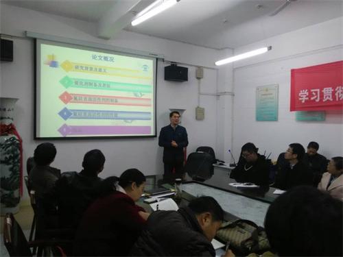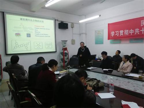 11月29日下午,化环学院在向学楼五楼会议室和向学楼201同时举行了两场学术报告会。在曹小华副院长的主持下,胡庆华、叶志刚、刘芬、黄华南、胡华南5位博士分别代表环境友好高分子与有机硅材料团队、多酸化学与绿色催化团队、化工过程与装备团队、精细化学品化学团队、工程中心团队在向学楼五楼会议室做了学术报告。在孙德四副院长的主持下,孙剑奇博士代表基于生物技术的矿产资源综合研究团队在向学楼201做了学术报告。学院全体教师参加了此次学术报告会。