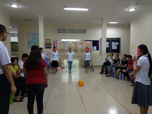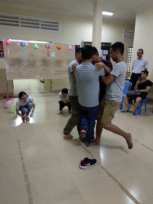 知识讲解完毕之后,活动进入了热闹的游戏环节。卞玥老师将同学们以小组为单位,抽取隐藏于灯笼内的神秘任务,完成了一个又一个新奇有趣的挑战。其中,筷子夹乒乓球接力赛、头顶气球、报纸站人、蒙眼取物等项目考验了队员间配合的默契度。为了完成挑战,学生们激动兴奋地游走于教室。此外,学生们五对五扳手腕比赛、五对五扑克脸对抗则考验了团队作战时取舍的智慧。而踢毽子、“斗鸡”、扳手腕等伴随一代代中国人成长的传统游戏,同样使得柬埔寨学生为之兴奋和着迷。