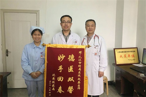家住湖口的沈奶奶30多年来患有反复胸闷、气促。今年3月病情加重,入临床医学院/附属医院重症医学科救治。患者入科时,呈昏迷状态,只能用呼吸机辅助呼吸。患者既往有慢阻肺、肺部感染,加上合并多个脏器的衰竭,病情极其危重。在科主任叶兴文的带领下,赵鑫医生制定了详尽的治疗方案,同时每天仔细询问患者的病情,护士们也耐心、细致的照顾,经过医务人员7天的精心治疗和护理,沈奶奶的病情日渐好转,由昏迷转为清醒,并痊愈出院。为表感激之情,沈奶奶的儿子专程从上海寄来了一面锦旗感谢ICU医务人员。