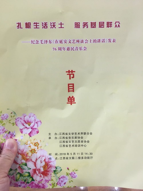 5月11日,纪念毛泽东《在延安文艺座谈会上的讲话》发表76周年惠民音乐会在省文联多功能厅举行,省文联领导和文艺界人士观看了音乐会。我校艺术学院教师叶树雯、王荇荇、理查德-波尔和戴笠等参加了演出。