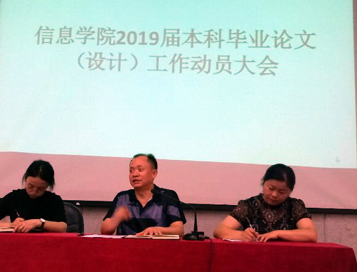 6月25日下午,信息科学与技术学院2019届本科毕业论文(设计)工作动员大会在文友楼一楼报告厅顺利举行。参与此次大会的有学院院长邓安远、教研科、学生科、各教研室负责人、本科毕业班班主任及2019届全体本科毕业生,会议由教研科副科长李翠玲主持。