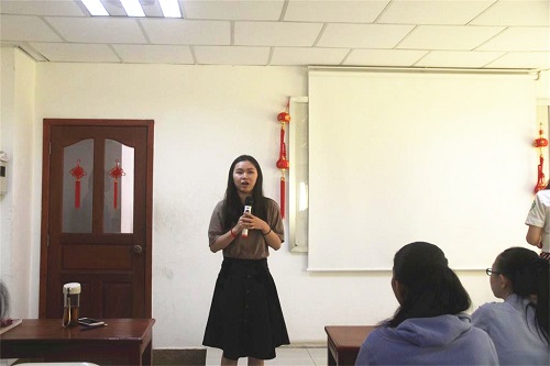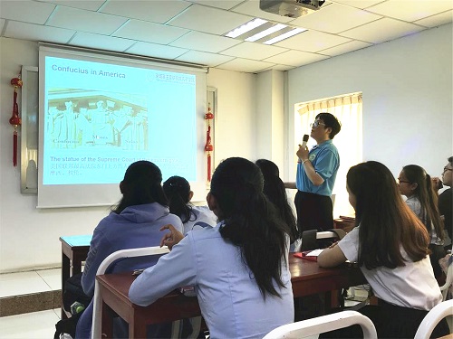 甘敏老师首先介绍了有关孔子的背景知识,从孔子的诞辰引出“孔子学院日”的由来,然后简要概括了《论语》一书所体现的孔子思想,并对《论语》中体现孔子教育、管理、法律等方面的言语进行举例讲解——如“己所不欲,勿施于人”等,就是鼓励学生们学习孔子的思想和为人处世之道。讲座期间,学生们不时与老师进行互动,对论语表现出了极大兴趣。学生黄金玲(OEUNG KIMLING)告诉大家:“学习中文给我的生活带来了很大变化,我以后也要像中国人一样,好好品读《论语》。”