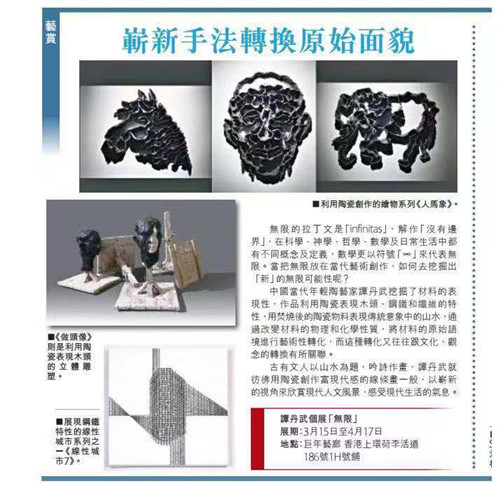 2019年3月15日,青年艺术家、九江学院艺术学院教师谭丹武个人作品展《无限》(展期:2019年3月15日至4月17日)在香港巨年艺廊(Giant Year Gallery)隆重开幕,来自香港本地和台湾的著名陶艺家赵素兰、关秀文、陈兰美等以及国内外藏家出席了开幕式。巨年艺廊是香港唯一专注推广本地及国际当代陶瓷艺术的艺廊,谭丹武是内地第一位受该艺廊特邀做陶艺个展的青年艺术家。