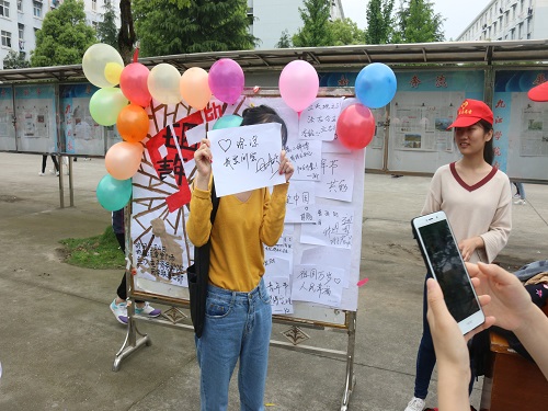 中午11点30分,活动拉开序幕,在张贴了海报的活动现场,青年志愿者们热情的邀请路过的同学写下寄语并张贴在展示板上,以此来宣传“五四青年节”。随后,志愿者们在现场表演了舞蹈,使活动现场的气氛活跃了不少,也吸引了更多的人前来观看。紧接着,志愿者们集体朗诵了梁启超先生的《中国少年说》,气势如虹,点燃了现场同学们的心中的火种。最后,志愿者们饱含深情的宣读了入团誓词,以此感怀团之精神。