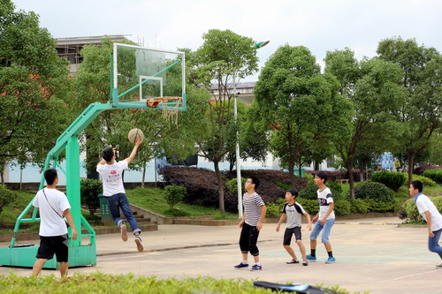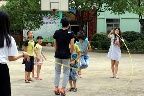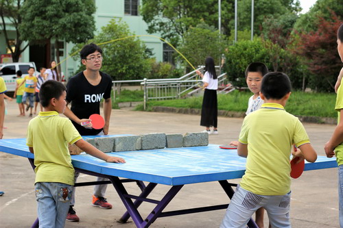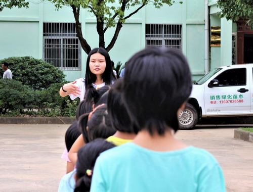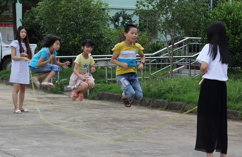 在天气宜人、凉风拂面的上午,王鹏伟小老师带孩子们到广场上排队集合,并给孩子们说明上课的注意事项,特别强调孩子们要注意安全。接下来王老师给孩子们分组,并发放运动器材。这时女老师带着低年级的小女孩踢毽子、跳长绳;而男老师则带着高年级的男同学打篮球和乒乓球。任务分配完后,负责的老师带领各自的同学到相应的场地活动。