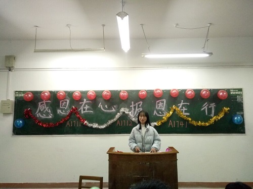 活动中,各班团支书首先讲述了自己对于感恩的领悟,这不仅仅是一种修行,更是一种责任,他们也提醒同学们,感恩要记在心中,报恩却是要付诸于行动的。随后,各班同学踊跃发言,表达自己对于此次活动主题的了解以及看法。其中,A1741班的崔宗泽同学说道:“我们要感恩别人的每一份给予,因为他完全可以不这么做。”而在竞知楼104教室,该班同学表演了诗朗诵——《感恩》。这朴实的字眼组成的却是深情的话语,目的是告诉同学们人性的美好,从任何一件小事上都可以体现出感恩,学会了感恩,便也学会了爱。