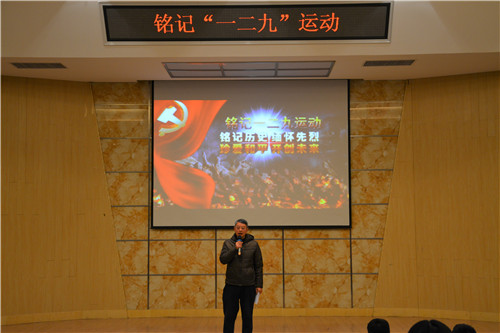 活动伊始,主持人阐述了举办“一二九”纪念活动的意义,历史学社社员黎志如通过PPT的形式为同学们讲解了“一二九”运动的历史背景及相关内容。随后,现场情景剧及一幕幕影片的展现,让同学们回顾了历史,深刻地体验当时爱国青年的满腔热血。诗歌朗诵和大合唱《中国军魂》更是将现场气氛推向高潮,同学们用朗读声和歌声表达着对革命先烈的崇高敬意。期间,主持人通过有奖问答的方式,让同学们进一步积累了相关历史知识。最后,刘华平老师为作了总结。他指出,当代大学生应该铭记历史,深刻地认识到“一二九”运动的伟大意义,做到“记耻不记仇”。老师还希望同学们能在今后的学习生活中“把握今天、认清形势,知识报国、开创未来”,从而完成“奋发有为、成人成才”的美好愿景。