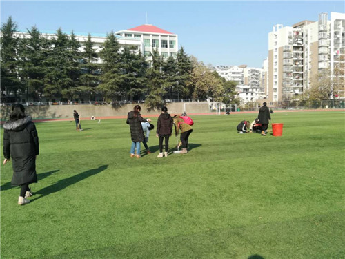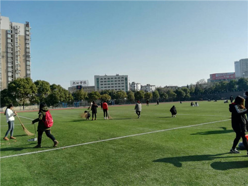 暖暖的阳光,绿油油的草地,同学们的笑脸,构成一幅美丽的画卷。同学们积极性很高,分工明确。有拿扫把扫落叶的同学,没有扫把的同学就仔仔细细的用自己的手将草坪上的落叶、垃圾等捡起。在所有参与成员的协作下,用了近四十分钟的时间足球场地就被大家打扫干净。最后,参加这次活动的同学们和操场大爷一起合影留念。