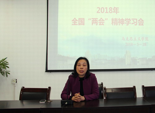 3月28日下午,马克思主义学院在香远楼212会室召开了2018年全国“两会”精神学习会,传达学习全国“两会”精神。马克思主义学院青年老师、校马克思主义宣讲团成员文媛媛博士做了题为《凝心聚力襄盛会扬帆奋进启新程》的辅导报告,马克思主义学院全体教职员工参加了学习会。学习会由马克思主义学院党总支书记、院长汪力平主持。