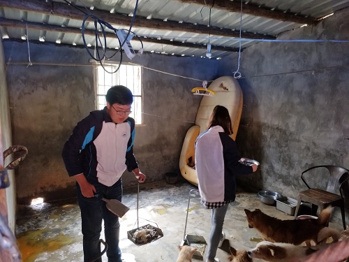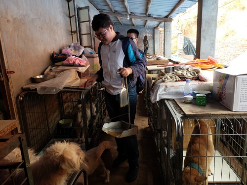 经过半个小时的登山之行,志愿者们终抵达目的地。随后,志愿者们跟随工作人员进入了流浪狗的小屋中。刚开始小屋内的一声声狗叫,着实让一些志愿者有些胆怯。但是志愿者们很快克服了内心的恐惧,志愿服务工作也开始顺利进行。志愿者们拿着铲屎工具走进一个个小屋,认真仔细的将狗狗的粪便进行清扫,用水清洗地面,再把地上积水扫到屋外,以防止它们感染皮肤疾病。随后,志愿者们细致地将每一个流浪动物的盆碗进行彻底的清洗并将其擦干,再换上水和食物,以保证流浪动物的饮食安全,避免病菌危害它们的健康。经过两个小时的辛劳工作,志愿者们完成了此次的志愿服务活动,赢得了工作人员的赞扬和肯定。