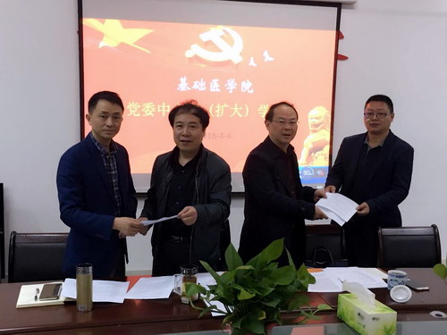 为深入学习贯彻全国“两会”精神,4月4日上午,基础医学院在华105会议室召开党委中心组扩大学习会。基础医学院党委全体成员、学院各部门负责人、各教研室负责人、各支部书记参加了学习会。会议由党委书记余朝阳同志主持。