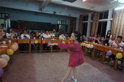 当晚,各班活动不断,呼声不断,学院领导的到来更是点燃了晚会的热潮。党委书记刘新强给每个班都送去了诚挚的中秋祝福,与同学们亲切地握手、拥抱,并演唱一首《朋友》带动大家的活动热情,刘书记强调:“大家齐聚九院,相聚化环,是一种缘分,希望大家今后快乐学习、快乐成长”;学生科科长吴敏、团委书记王颖和新生辅导员柏杨分别演唱了《咱当兵的人》、《打靶归来》等歌曲,祝福大家学习进步、身体健康、生活愉快;17级老生还精心编排了舞蹈《思美人》,让人眼前一亮。