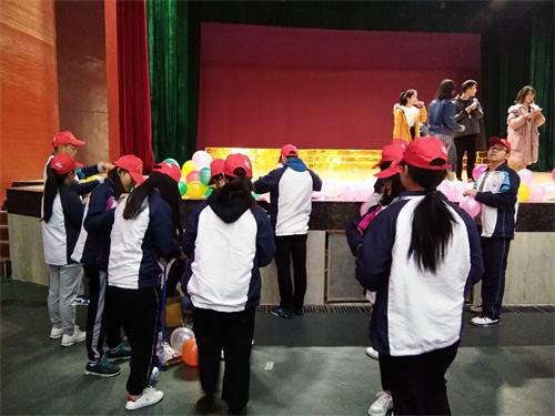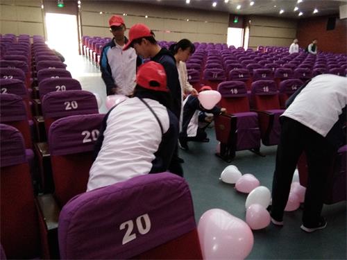 上午九点,志愿者们穿着统一的着装在大礼堂门口集合完毕。随后,负责人根据迎新晚会场地的布置要求逐一分配大家的工作,有些人负责为气球充气,有些人负责将气球捆扎好,还有些人负责用扎好的气球装饰装饰舞台、观众席……在志愿者们一点一滴的辛苦付出下,学校大礼堂慢慢地有了晚会温馨热闹的氛围。当大礼堂焕然一新后,青年自愿者们在大礼堂门口集合,负责人对今天的任务完成情况进行总结,表扬了大家的积极性,并鼓励大家积极参与今后的服务活动。